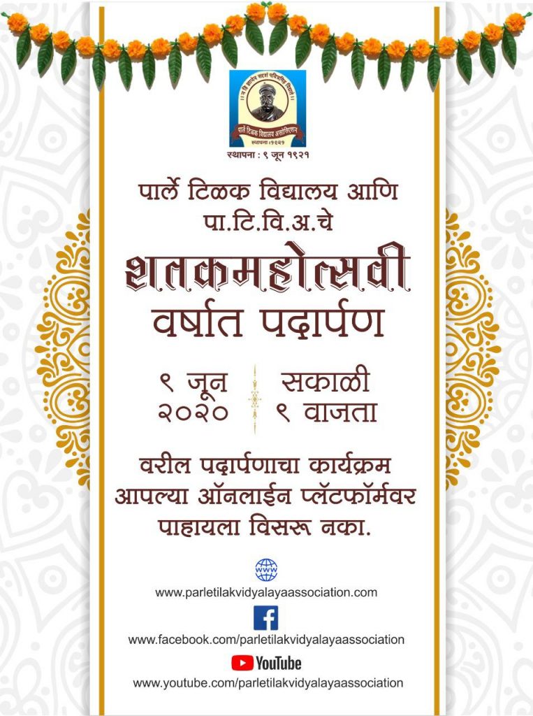 ९ जून २०२० रोजी आपली शाळा, पार्ले टिळक विद्यालय आणि त्याच बरोबर पार्ले टिळक विद्यालय असोसिएशन (PTVA) ,ही आपली संस्था, शंभराव्या वर्षात पदार्पण करत आहे.